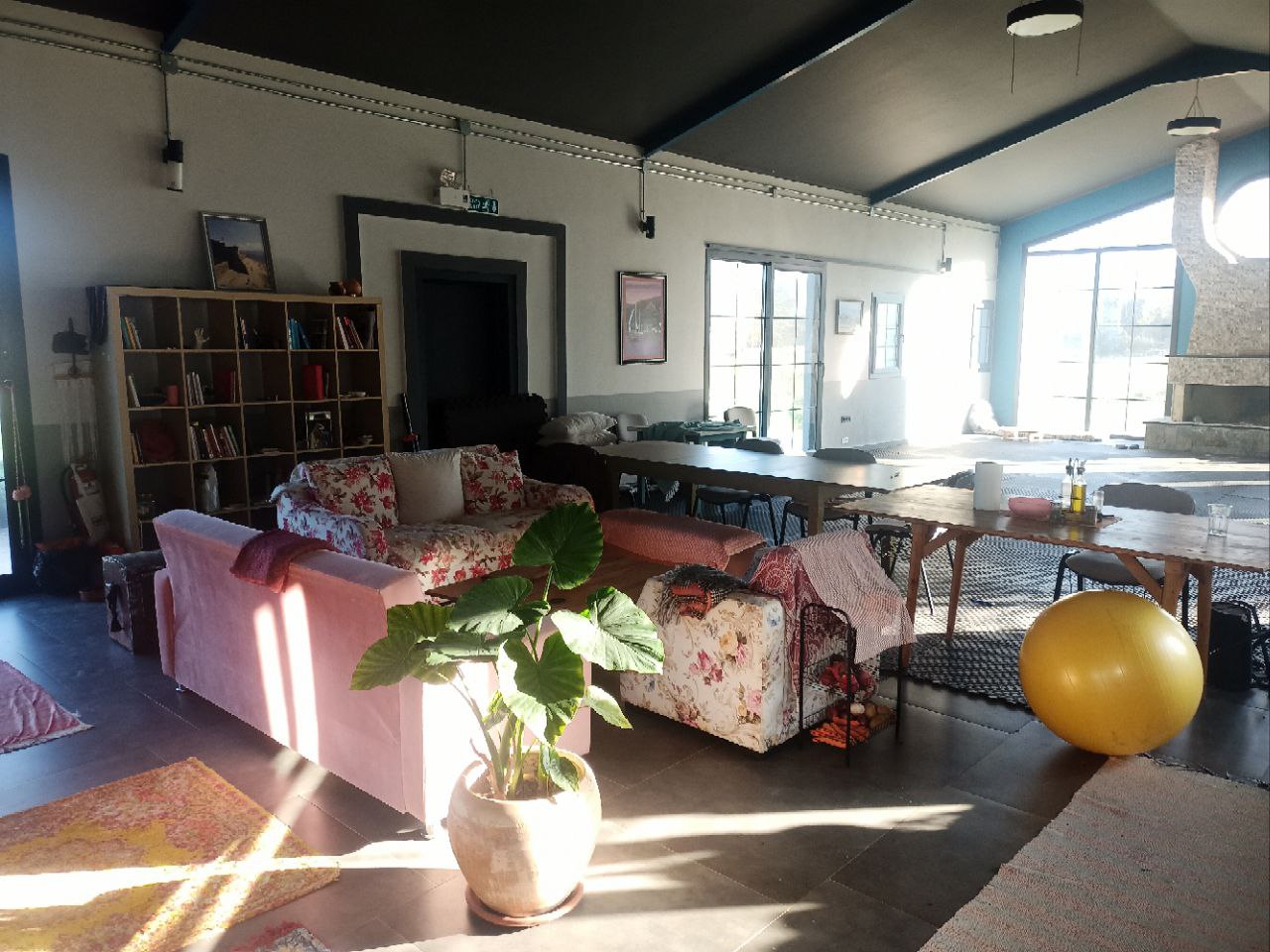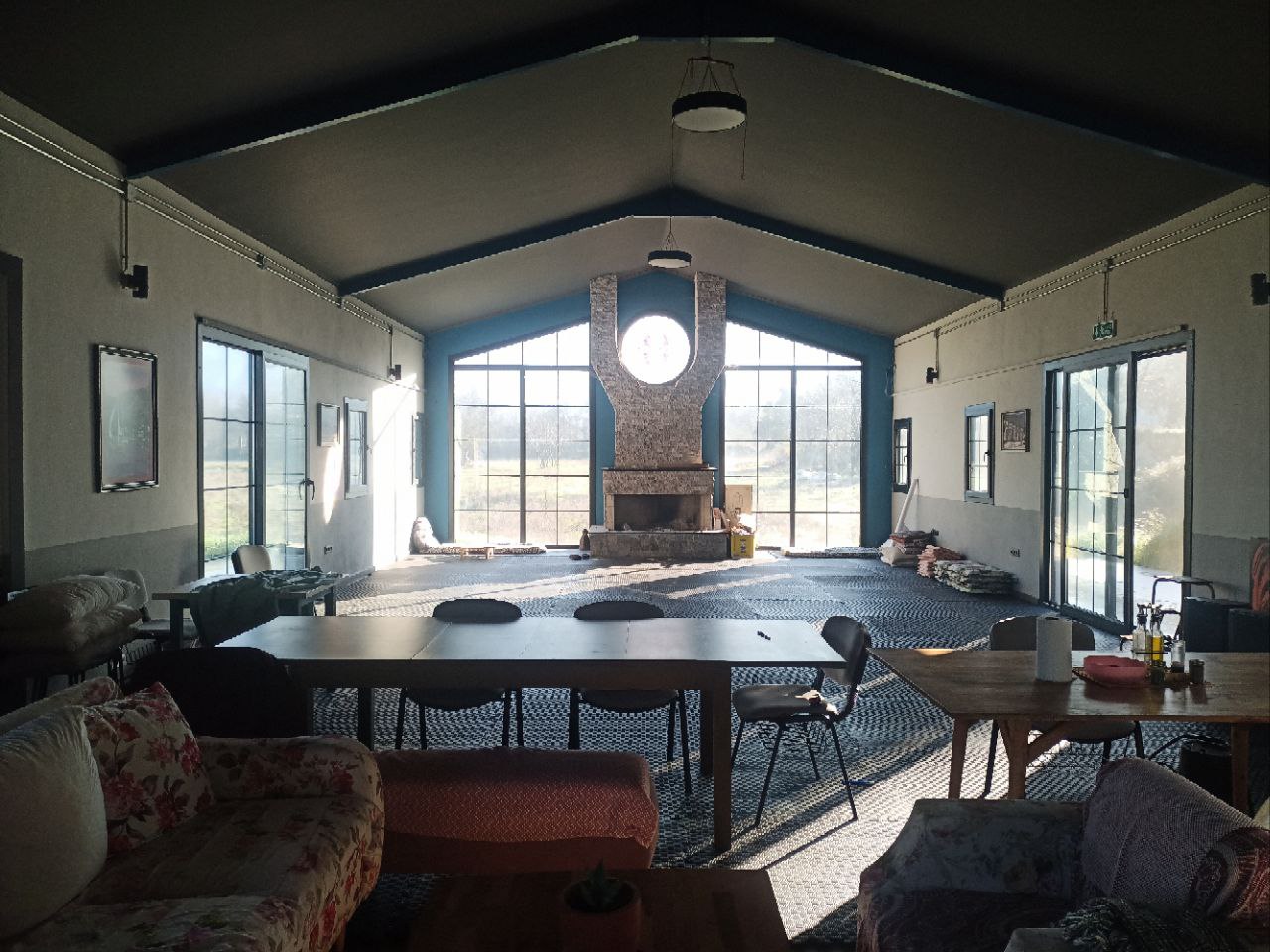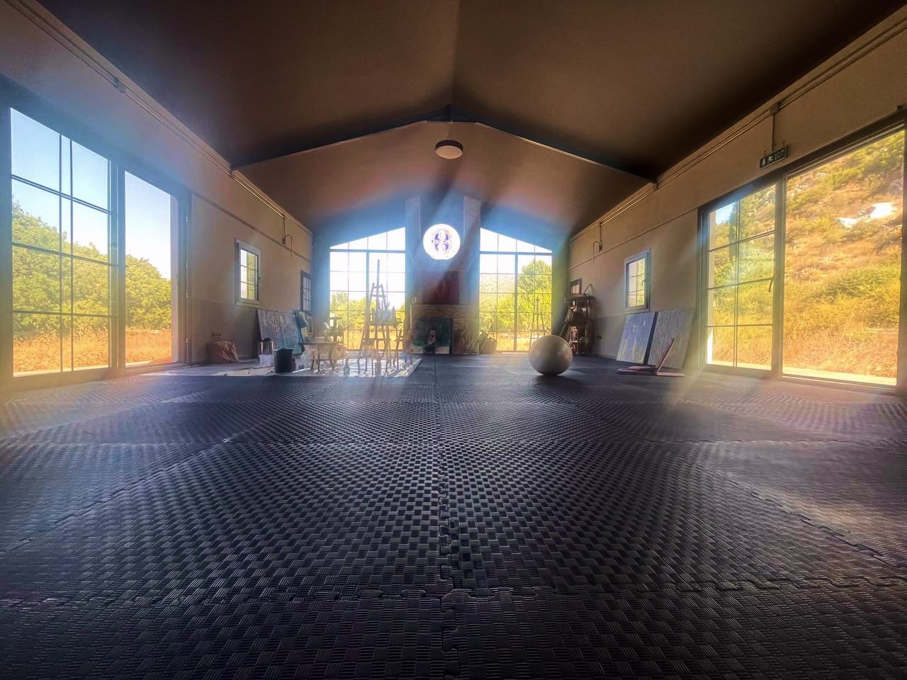 Our space is covered nearly 160 sqm + 30 sqm loft with all natural surroundings visible through the glass windows and doors. On the floor it's settled with puzzle mats to enable soft landing for movers of any kind.